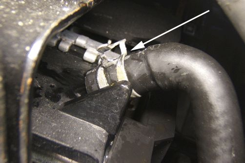 8. Using a non-silicon based tire lubricant, lightly coat the check valve (P/N 20876185) and insert it in to the radiator hose return line 15 mm (0.5 in) in the hose with the tapered end pointing toward the radiator nipple. Press the hose on to the nipple and seat the hose to the base of the fitting. This will push the check valve further in to the hose resulting in a slight bulge in the hose.