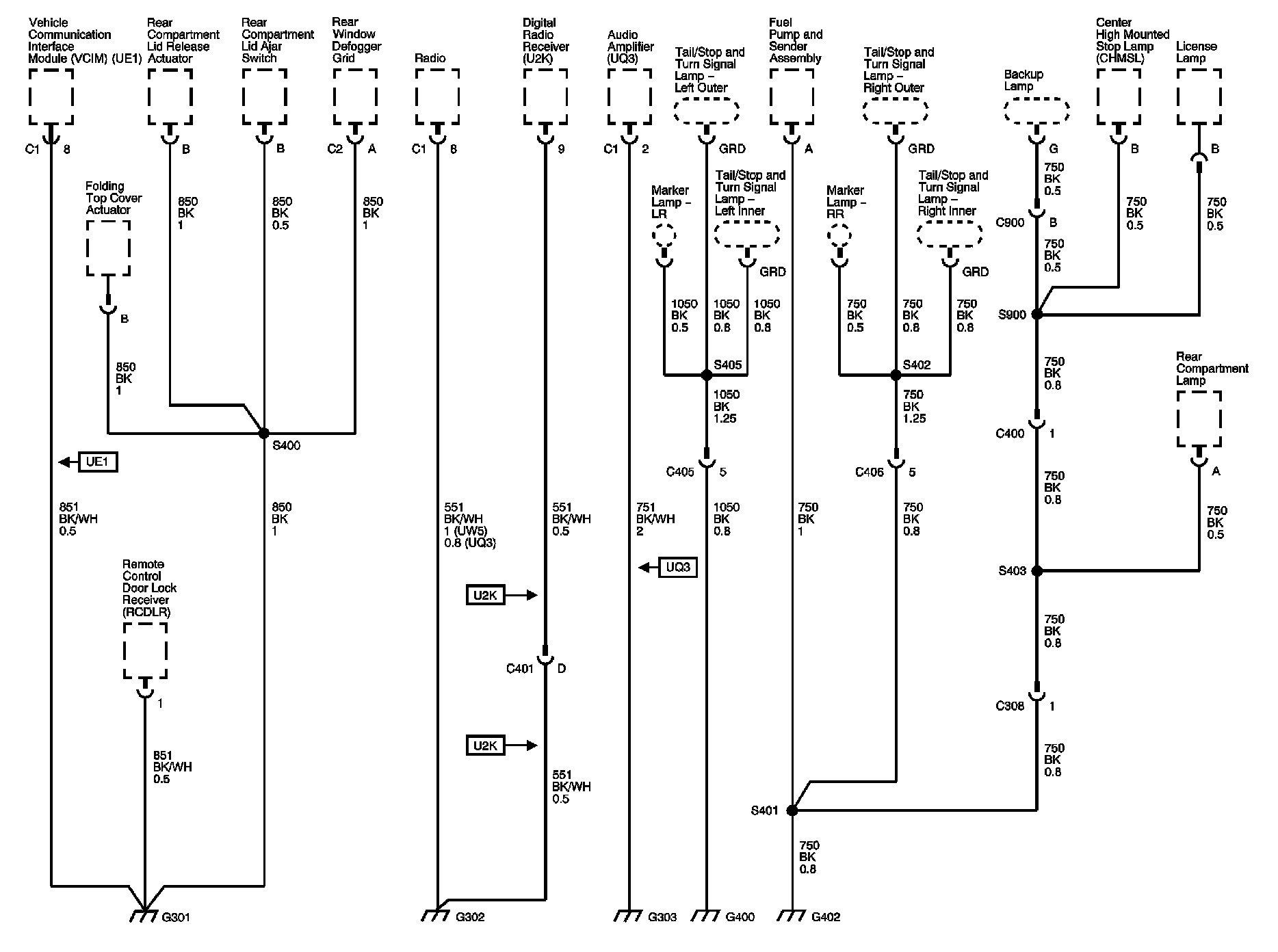 The locations for the Connectors, Grounds, Splices, and Grommets shown within these diagrams can be found via their numbers at Vehicle Locations.