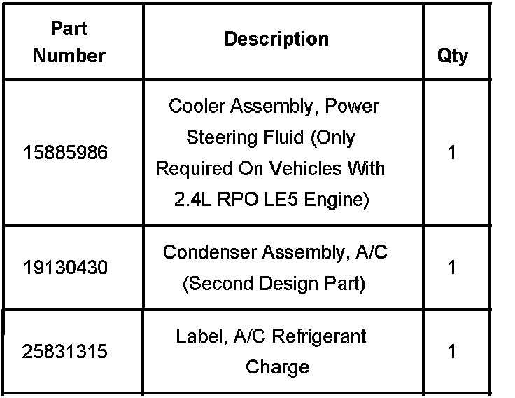 The new A/C condenser will also require the installation of a new design power steering cooler, P/N 15885986, on vehicles equipped with the 2.4L (RPO LE5) engine.