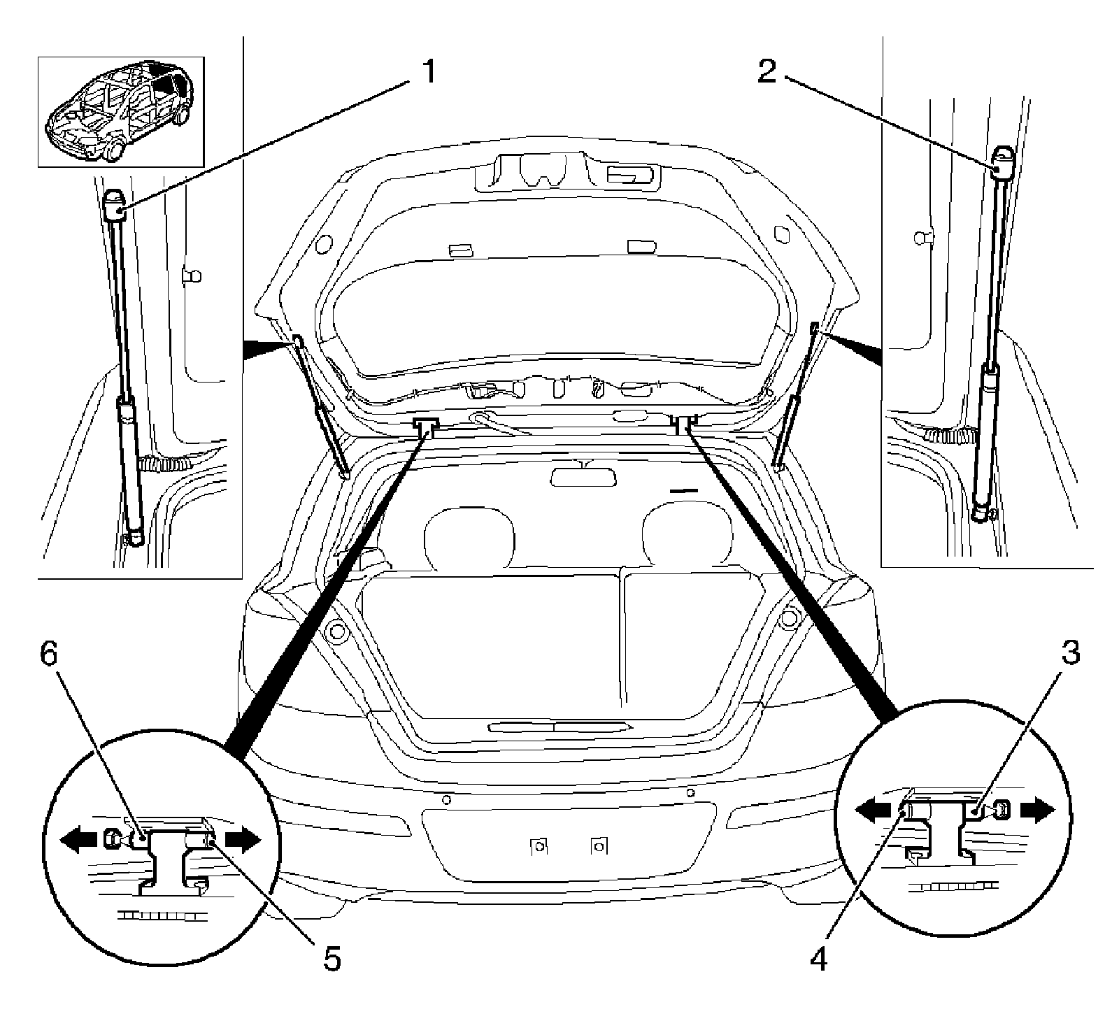 6. Remove the securing rings (3 and 6) from the liftgate hinge pins.