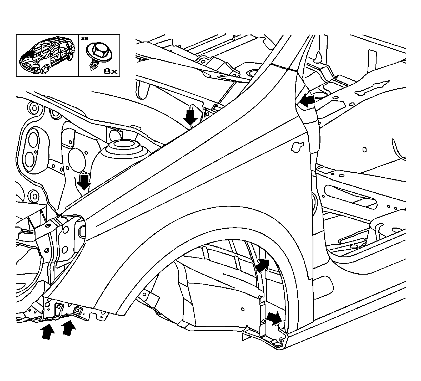 3. Remove the front fender liner of the fender. Refer to Front Fender Liner Replacement (Service and Repair) .