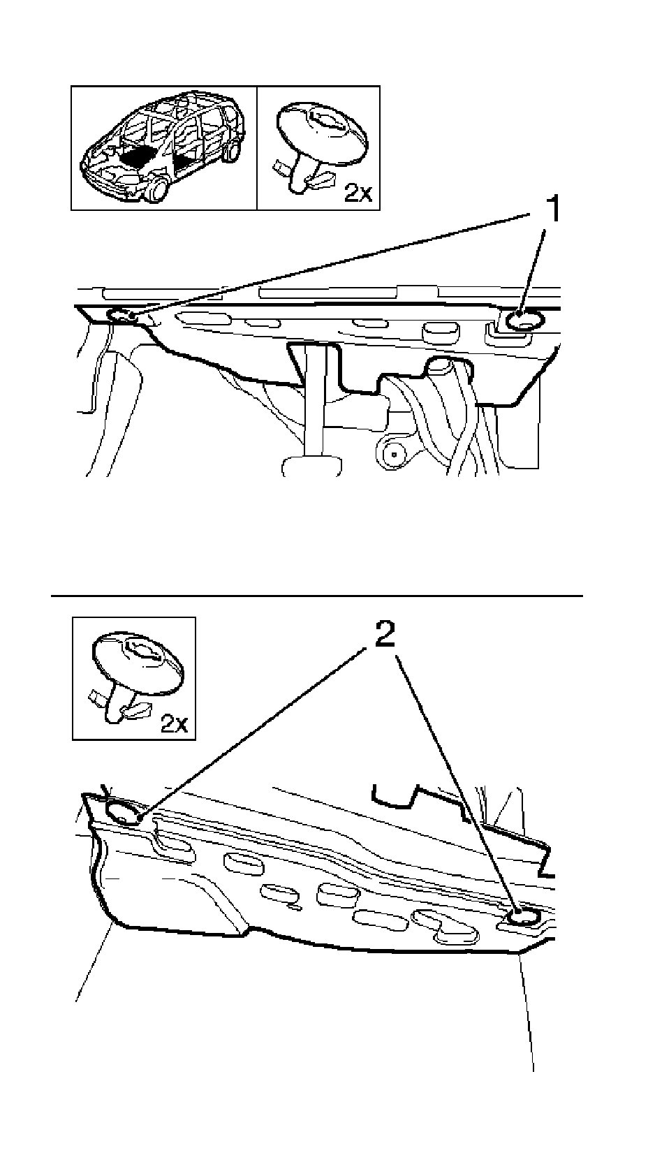 * Remove the 2 retainers (2) on the passenger side and remove the I/P insulator from the bracket.