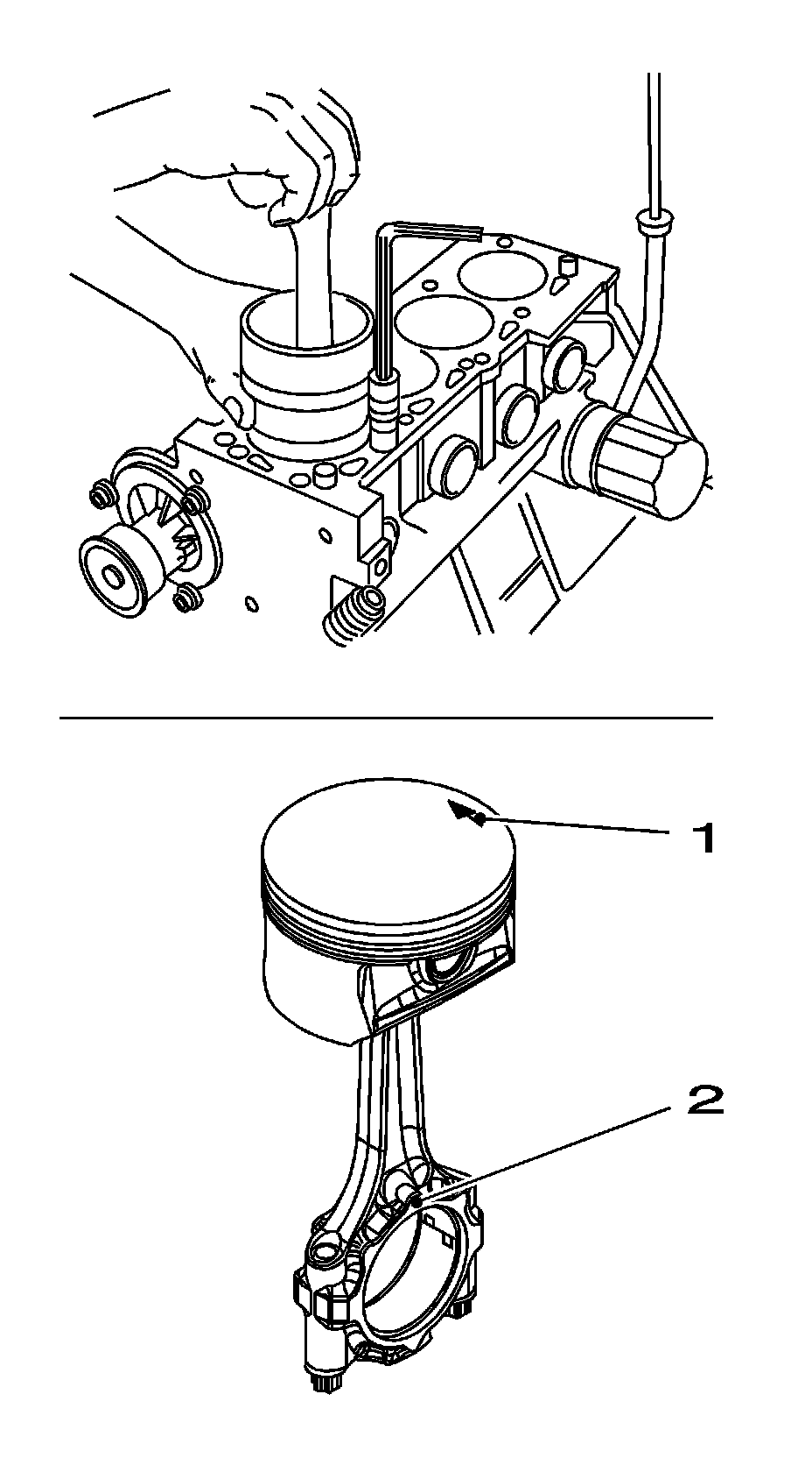 Important: Arrow (1) on piston head points to the engine timing side, bead (2) on con-rod points to the transmission side of the engine.