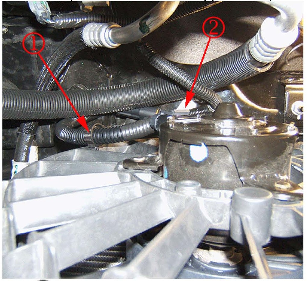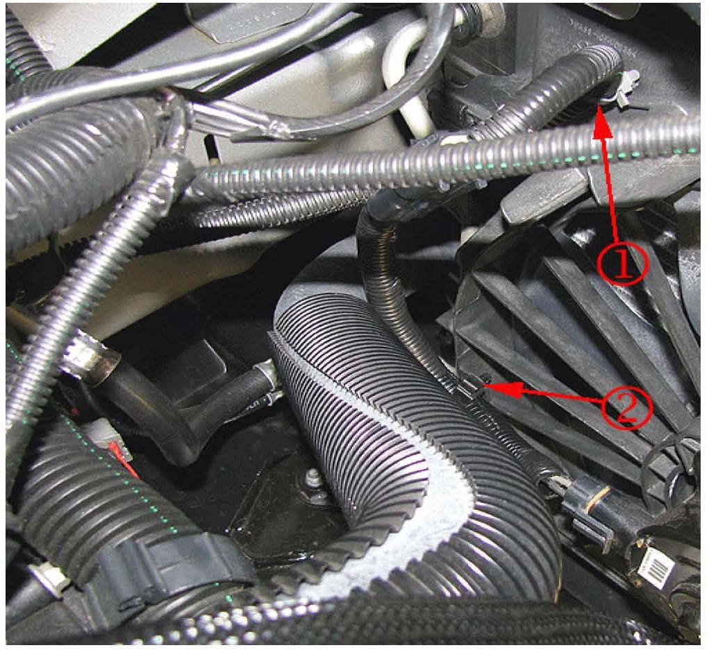 3. Disconnect the left cooling fan electrical connector. Remove the wiring harness clip from the fan shroud. Connect the engine cooling fan jumper harness to the fan connection. Secure the jumper harness to the fan shroud (location 2) using the clip. Secure the existing wiring harness clip to the fan shroud upper hole (location 1).