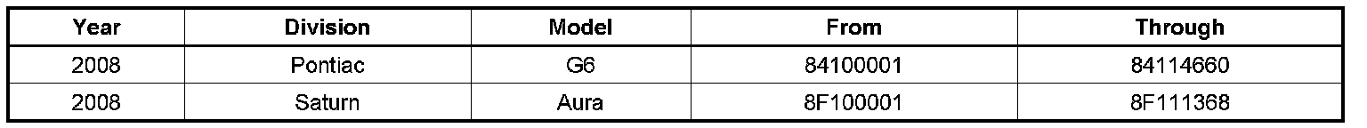 Involved are certain 2008 Pontiac G6 and Saturn Aura vehicles built within the VIN breakpoints shown above.