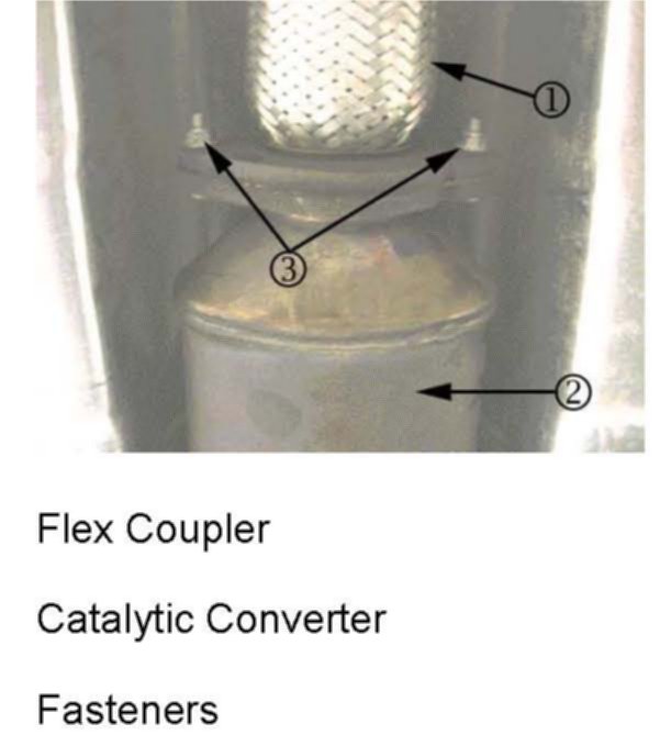 8. Install the two fasteners (3) at the catalytic converter (2) to flex coupler (1) location.