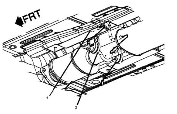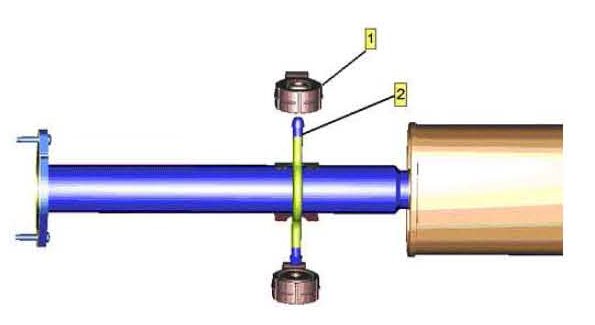7. Install the isolator (1) to the muffler hanger rod (2).