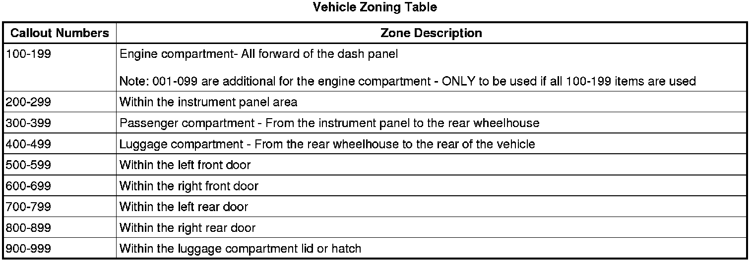 All grounds, in-line connectors, pass-through grommets, and splices have identifying numbers that correspond to where they are located in the vehicle. The following table explains the numbering system.