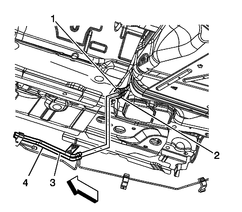 11. Disconnect the fuel tank EVAP pipe quick connect fitting (2) from the chassis EVAP pipe (4). Refer to Plastic Collar Quick Connect Fitting Service (Plastic Collar Quick Connect Fitting Service).