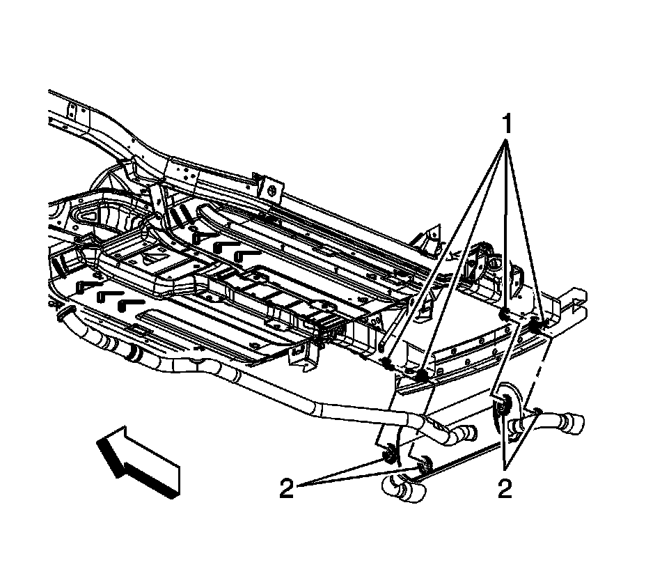 9. Separate the muffler insulators (2) from the hangers (1).