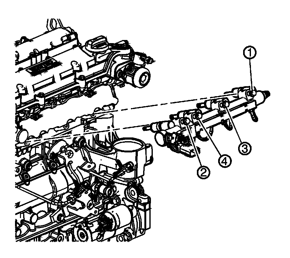 9. Install the 2 outer fuel rail bolts (1) first hand tight, and then install the remaining 2 bolts, hand tight.