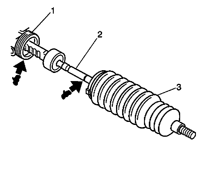 1. Apply grease to the steering linkage inner tie rod (2) and the steering gear (1) prior to installing the steering gear boot (3).