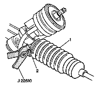 5. Crimp the steering gear boot clamp (2) on the steering gear boot (1) using tool J 22610 .