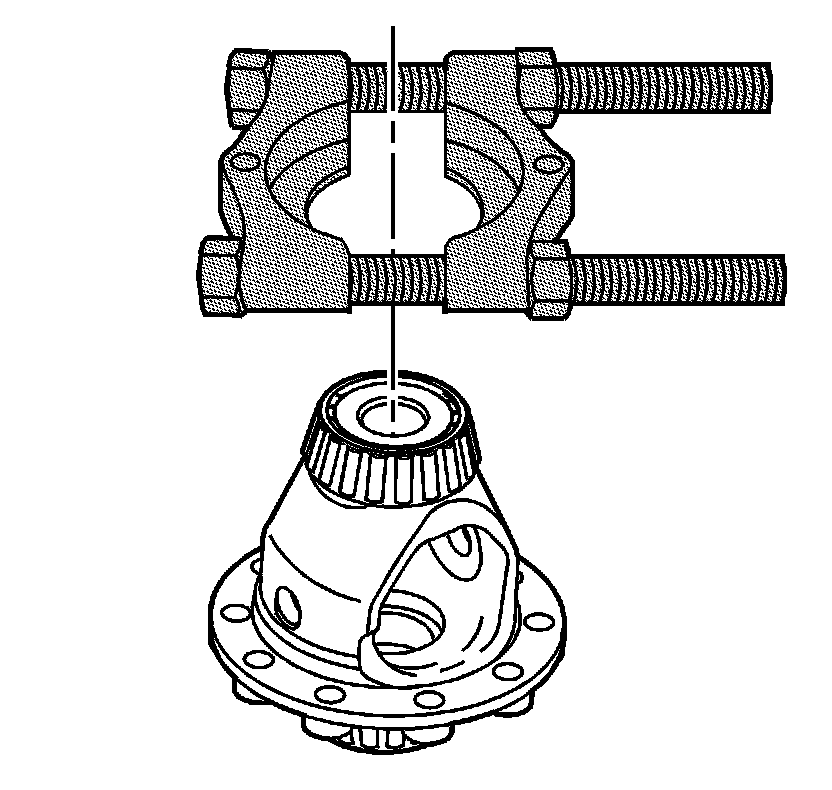 2. Using the J 22912-B and a press, remove the left side bearing. It may be necessary to cut the cage and remove the rollers so the tool will grip the race.