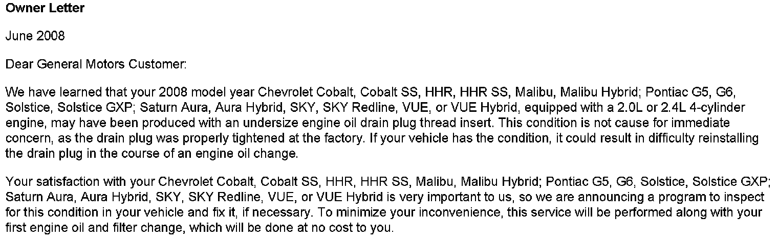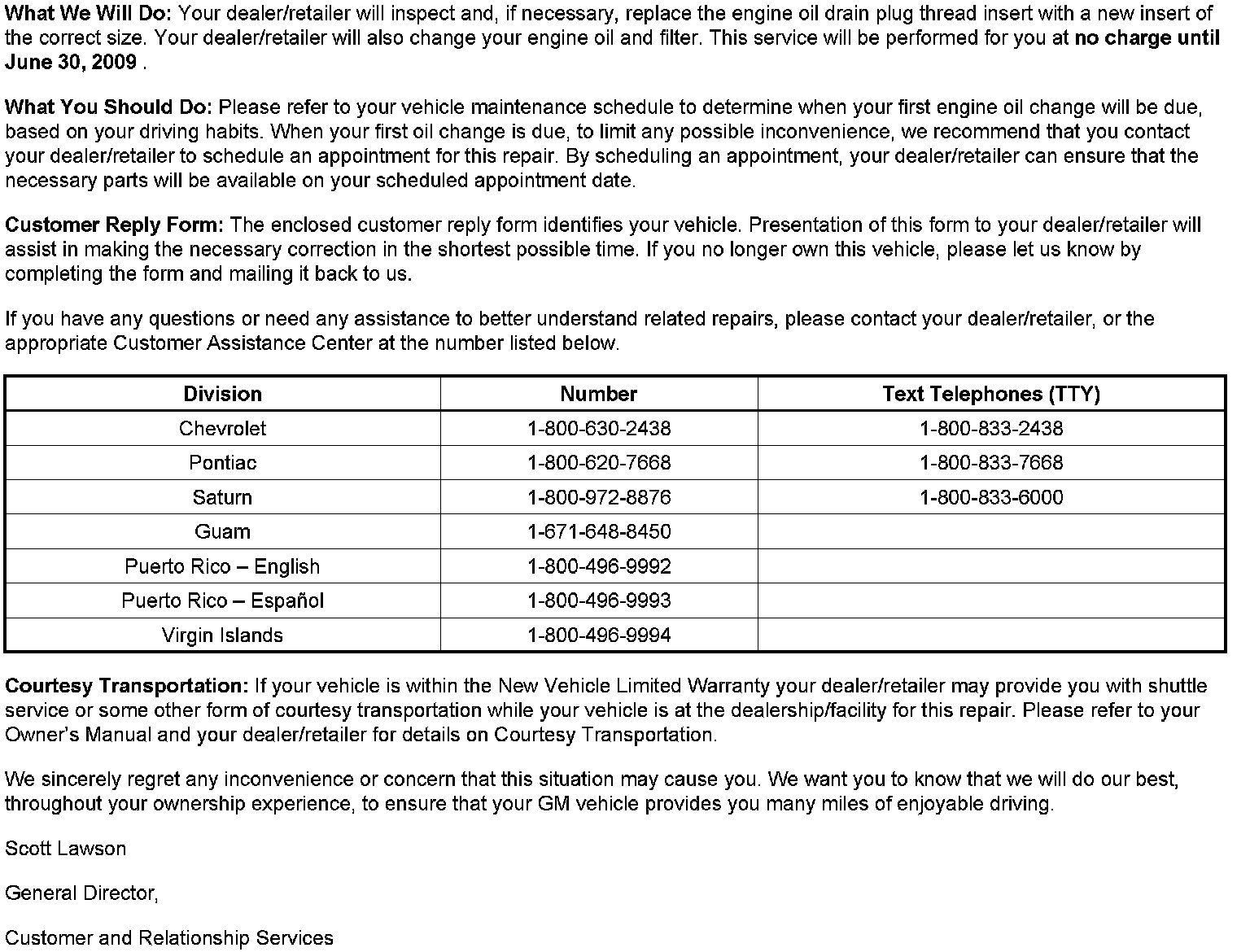 Campaign - Engine Oil Pan Drain Plug Threaded Insert