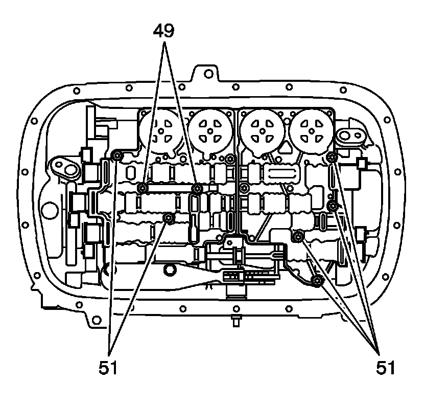 6. Install the control valve body accumulator assembly bolts (49, 51) into the case (24) and hand tighten.