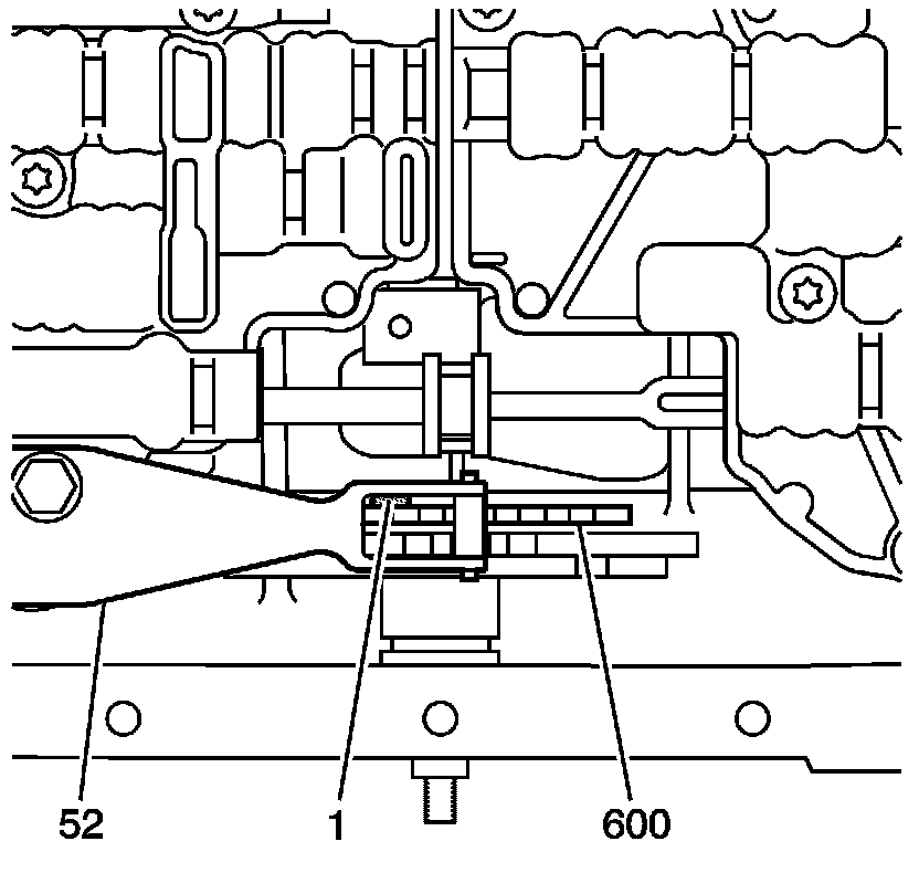 8. Install a 0.8 mm spacer (1) between the manual shaft detent lever (600) and the manual shaft detent assembly (52).