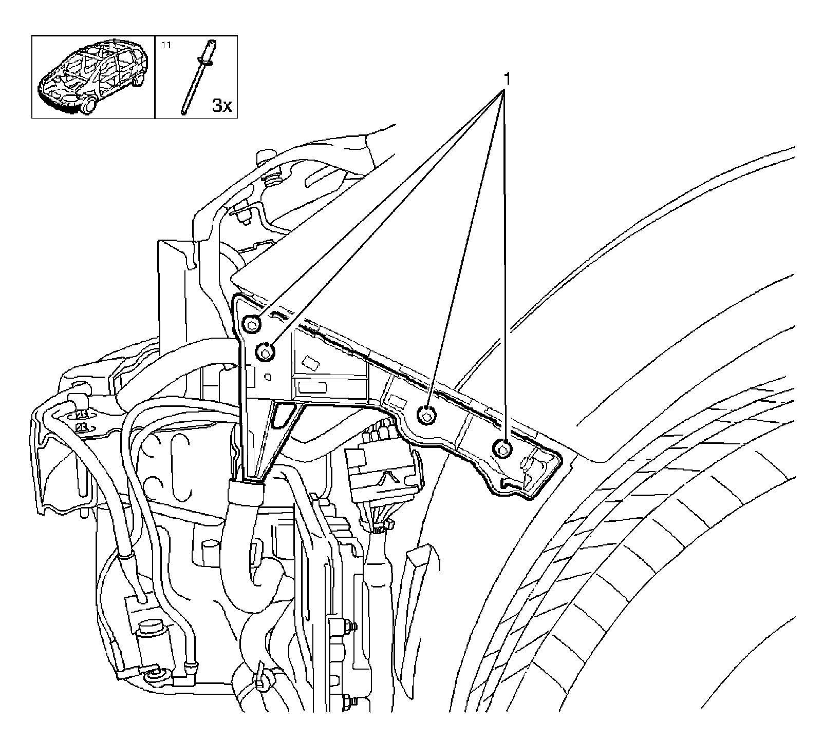 3. Remove the front fender liner of the fender. Refer to Front Fender Liner Replacement (Service and Repair).