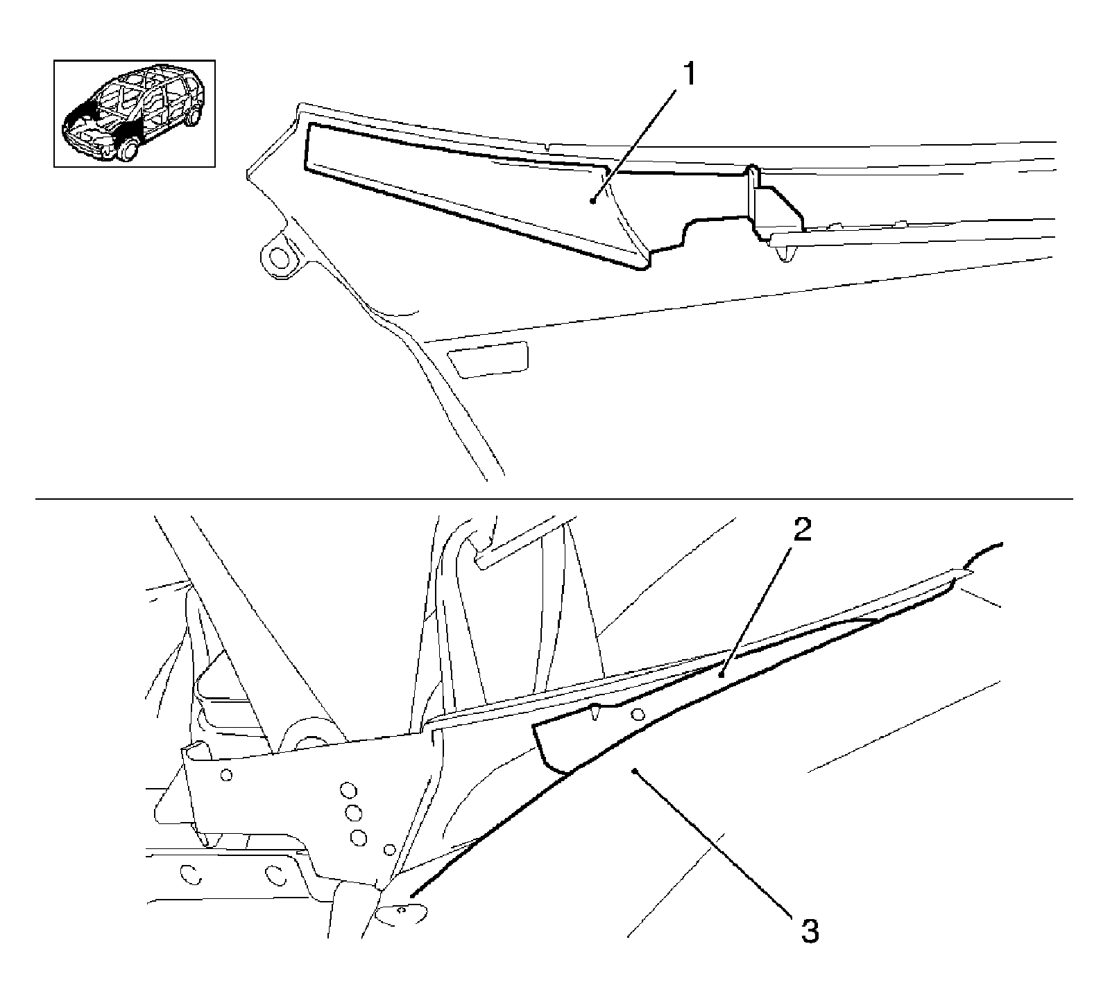 Remove the adhesive (2) from the A-pillar (3).