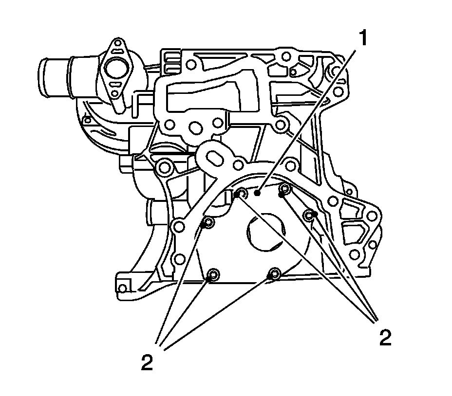 2. Install the oil pump cover (1) and bolts (2). Tighten the 6 bolts to 8 Nm (71 lb in).