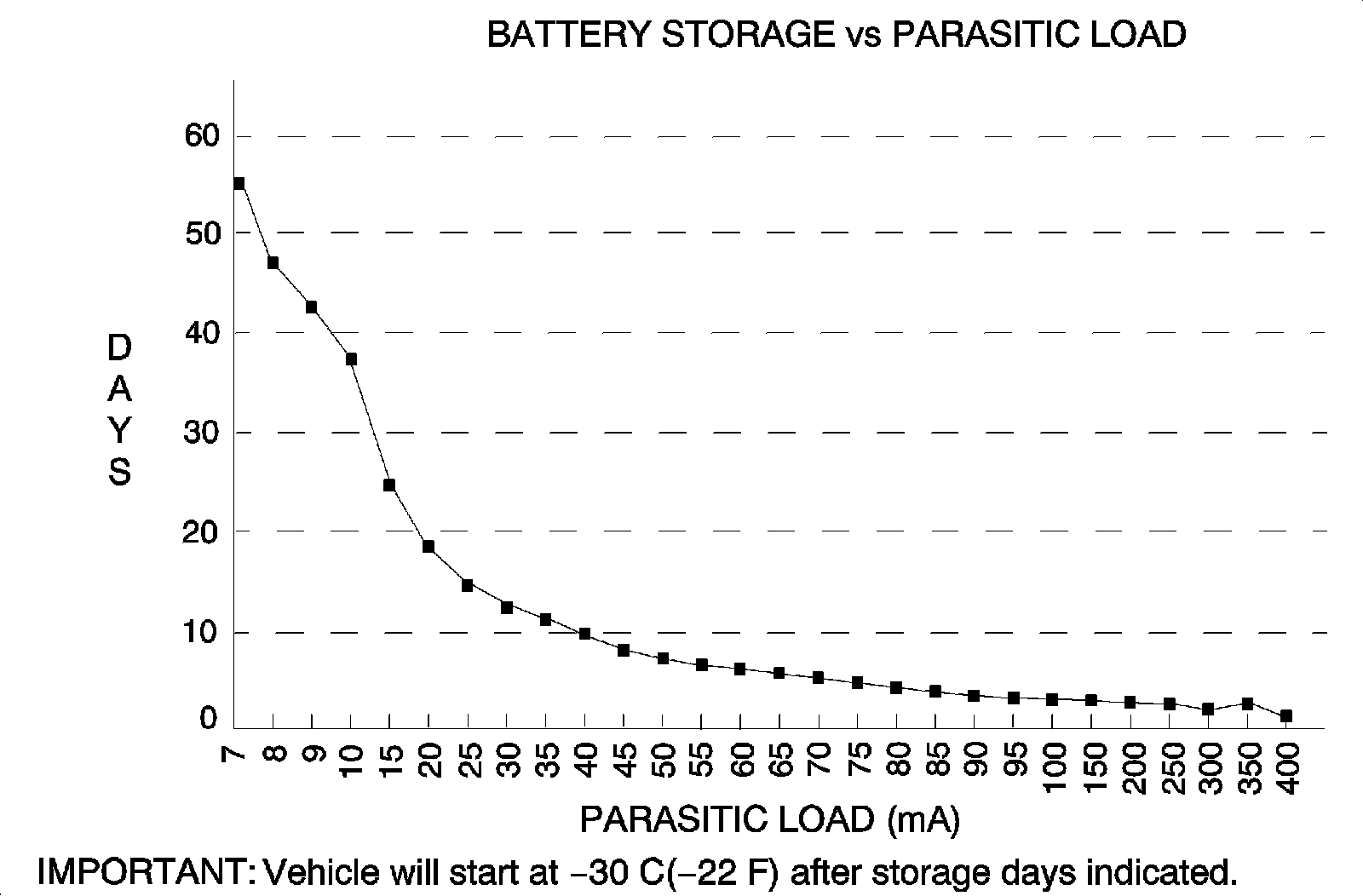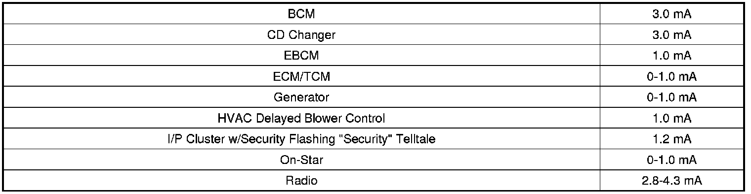 Typical parasitic load for this vehicle is 10-15 mA. If the vehicle does not have one of the following components, then subtract the parasitic load of the component for typical parasitic load of the vehicle (10-15 mA) to determine the parasitic load range for the vehicle being tested.