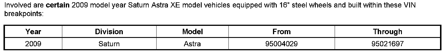 General Motors has decided that certain 2009 model year Saturn Astra vehicles fail to conform to Canada Motor Vehicle Safety Standard (CMVSS) 110, Tire Selection and Rims. Certain vehicles have a tire information label bearing the wrong front tire size information (P2105 /55R16) rather than the intended (P205 /55R16). As a tire with the incorrect tire size is not possible, this error has no effect on vehicle safety.