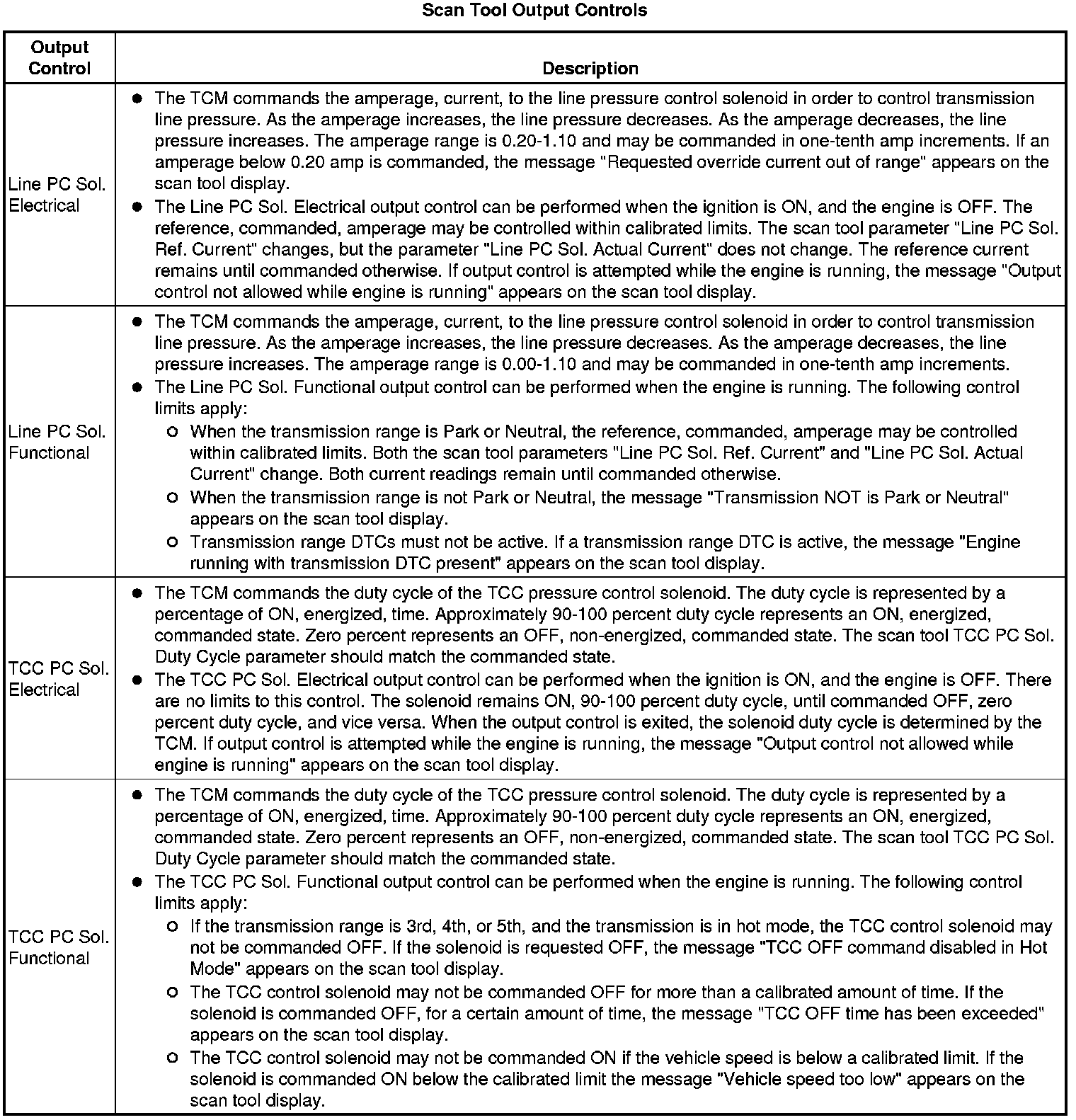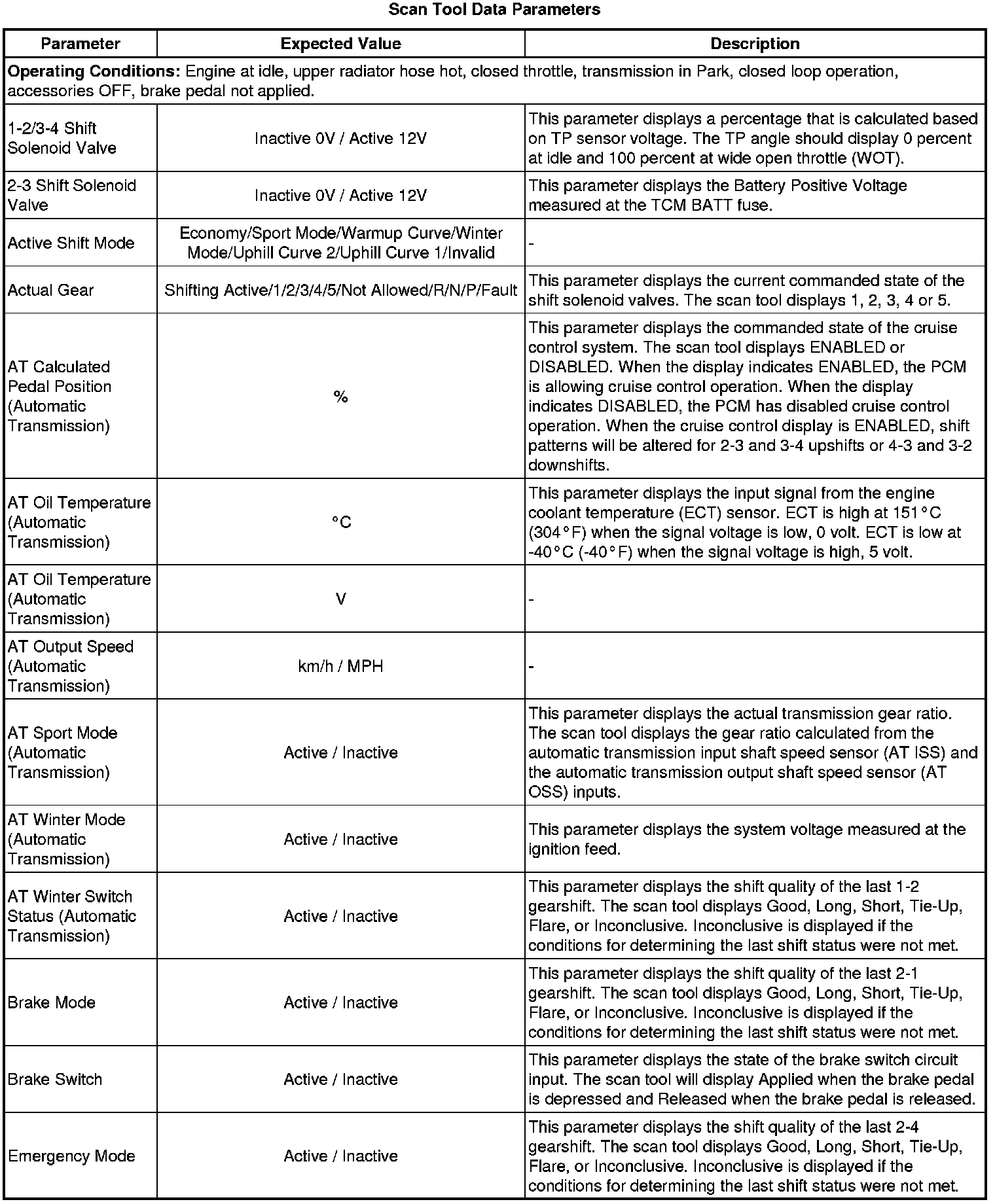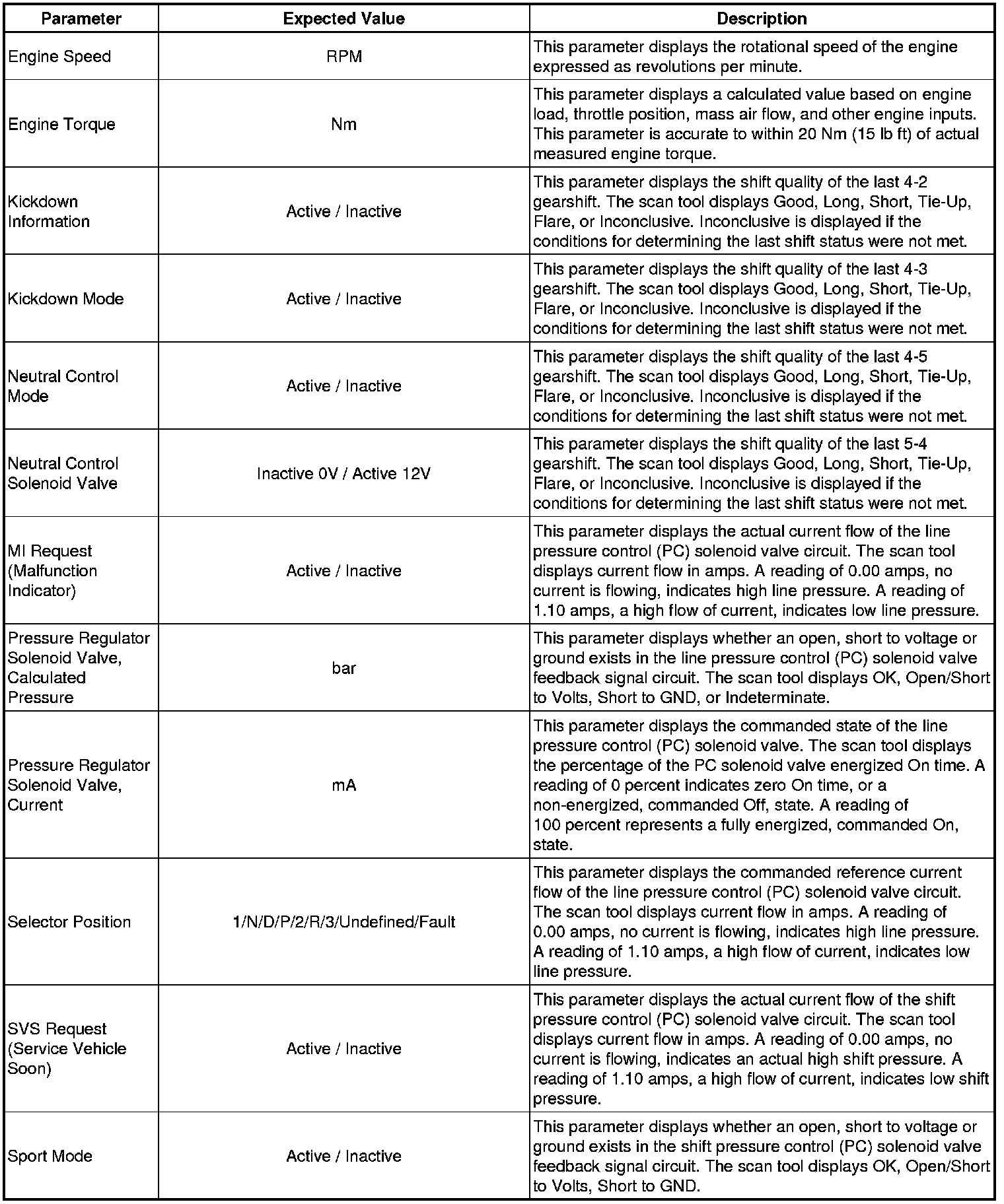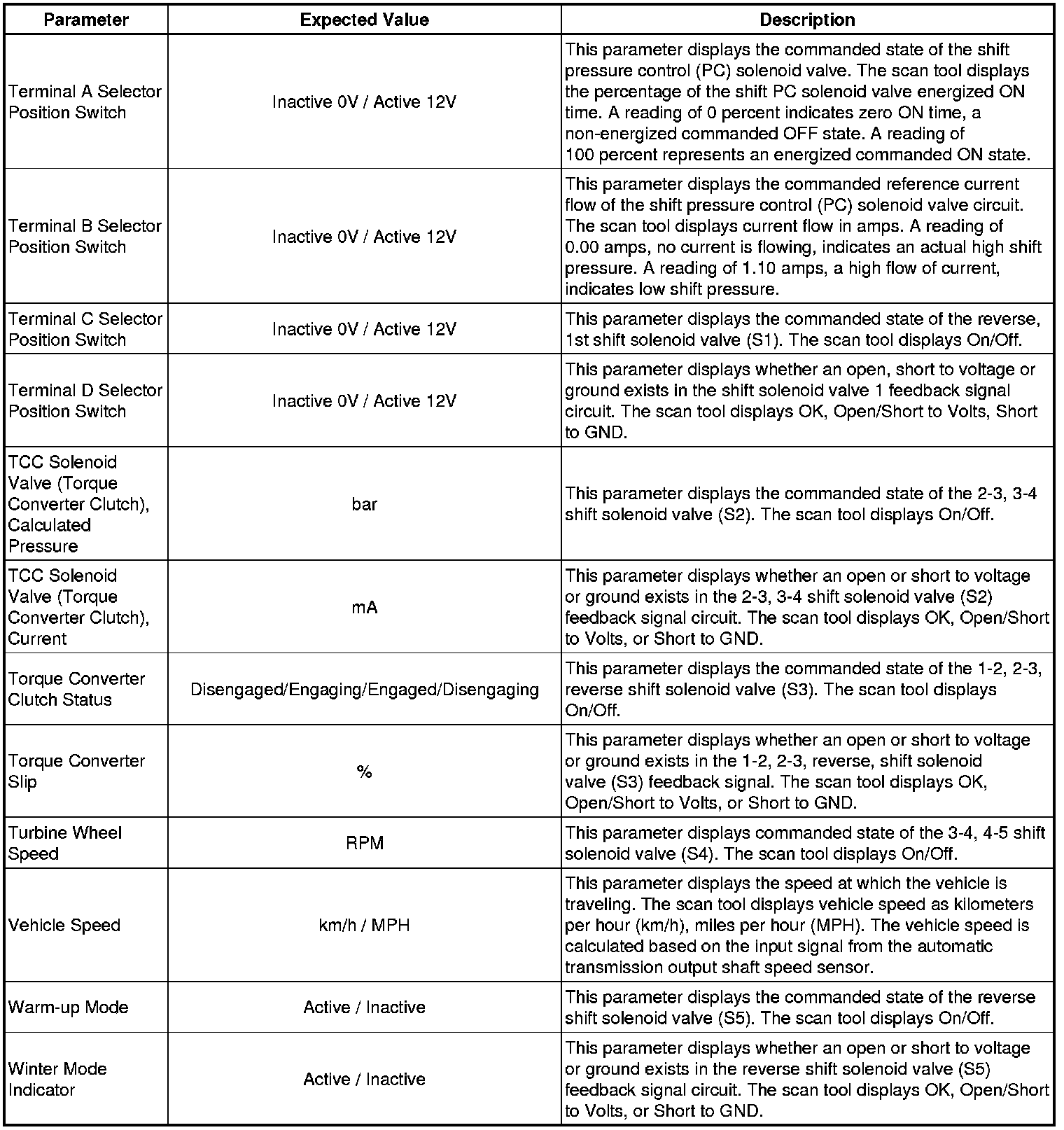 The Transmission Control Module Scan Tool Data List contains all transmission related parameters that are available on the scan tool. The list is arranged in alphabetical order. A given parameter may appear in any one of the data lists, and in some cases may appear more than once, or in more than one data list in order to group certain related parameters together.