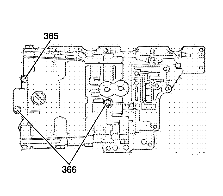 6. Place the 3 middle control valve body bolts (365, 366) in the rear valve body.