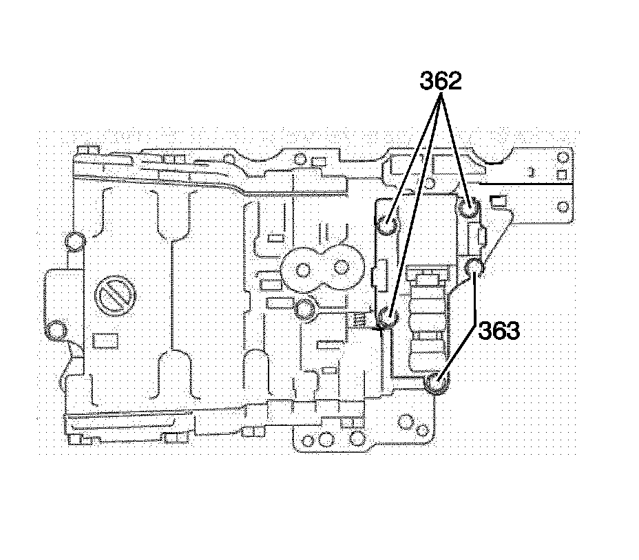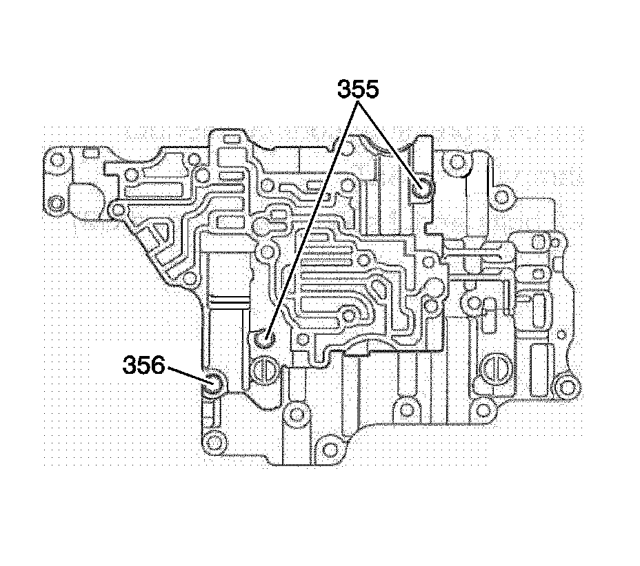 18. Temporarily tighten the 3 front valve body bolts (355, 356).