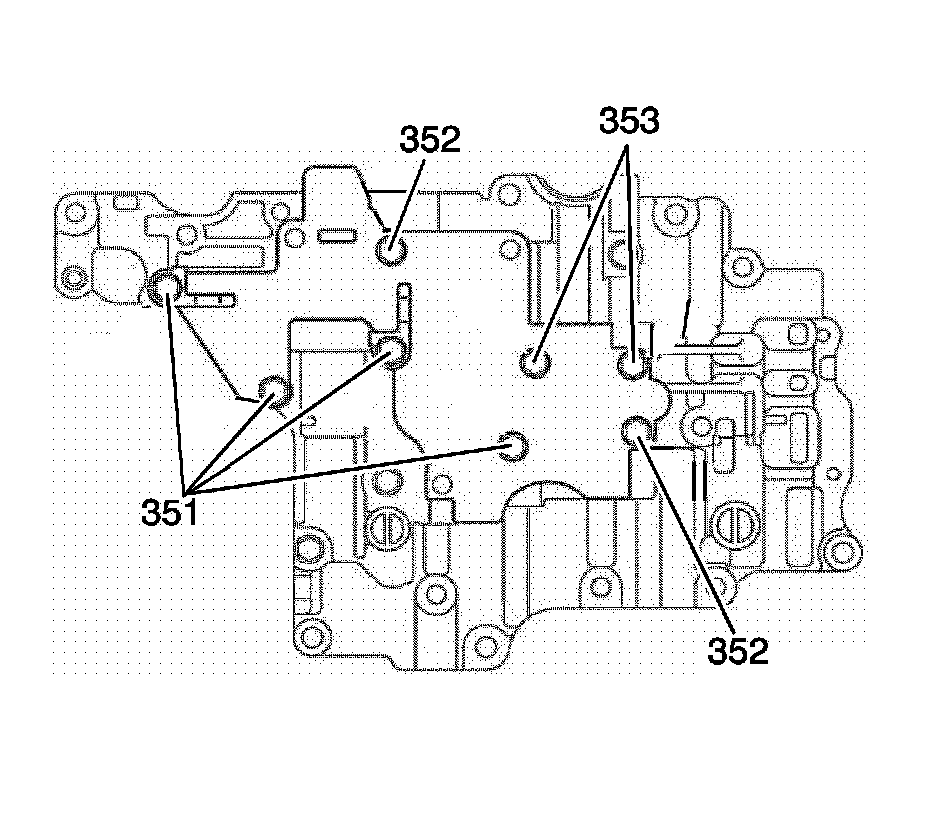 22. Place the 8 front control valve body cover bolts (351, 352, 353) onto the assembly.