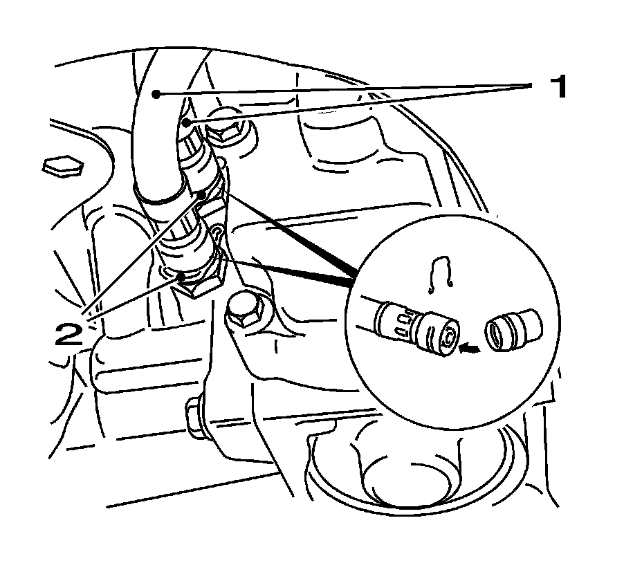 2. Remove the upper radiator hose (1) from the thermostat (2).