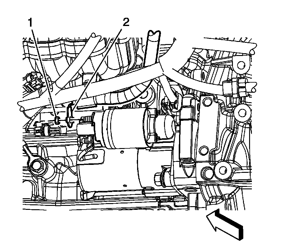 6. Remove the positive battery cable clip (2) from the oil level indicator tube bracket (1).