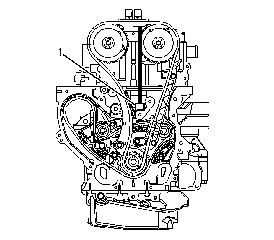 8. Install the timing chain retention tool EN-48749 (1) to the exhaust side of the timing chain.