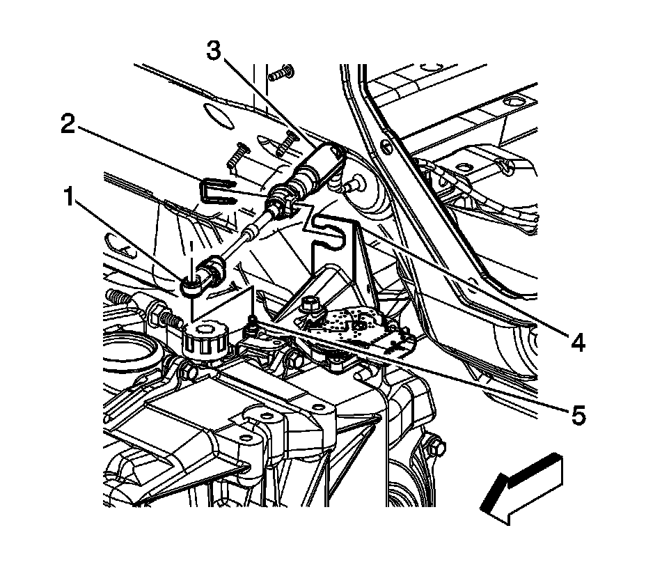 5. Disconnect the transaxle shift control cable terminal (1) from the transaxle manual shift lever pin (5).