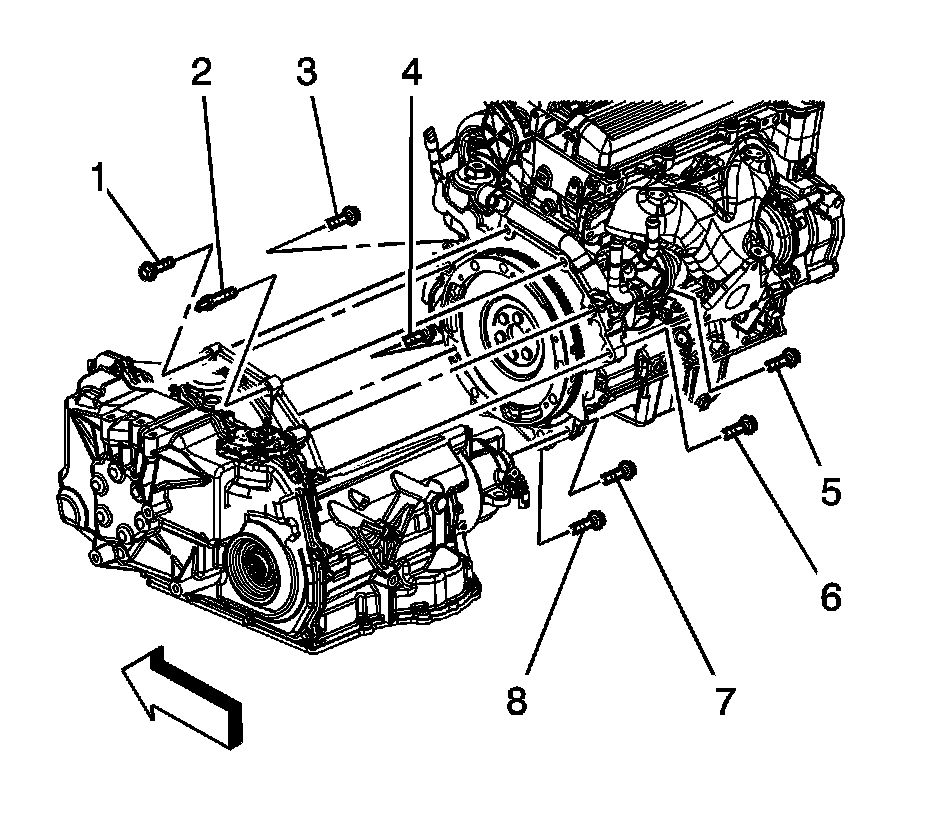 10. Install the torque converter to flywheel bolts and tighten to 60 Nm (44 lb ft).