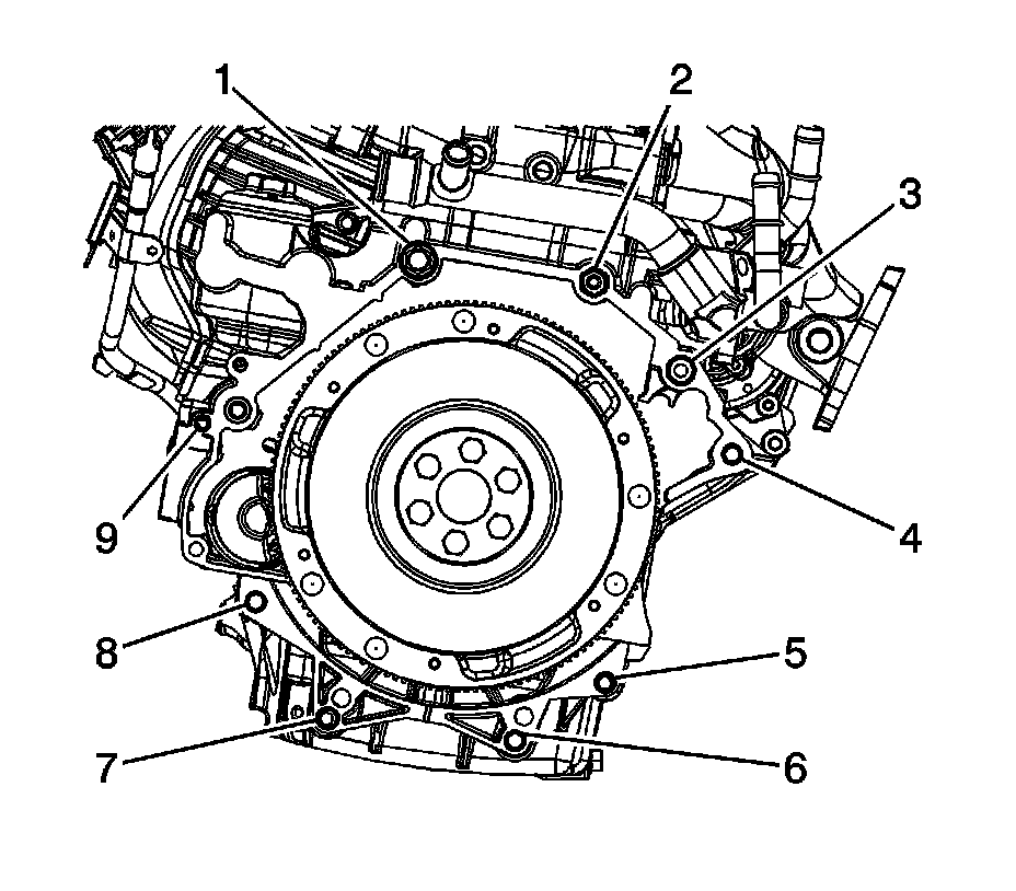 4. Install the lower transaxle to engine bolts (5, 6, 7, 8, 9) and tighten to 75 Nm (55 lb ft).