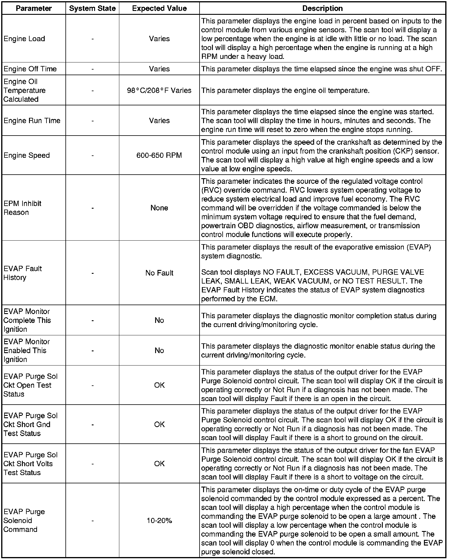 The Engine Control Module Scan Tool Data List contains all engine-related parameters that are available on the scan tool. The list is arranged in alphabetical order. A given parameter may appear in any one of the data lists, and in some cases may appear more than once, or in more than one data list in order to group certain related parameters together.
