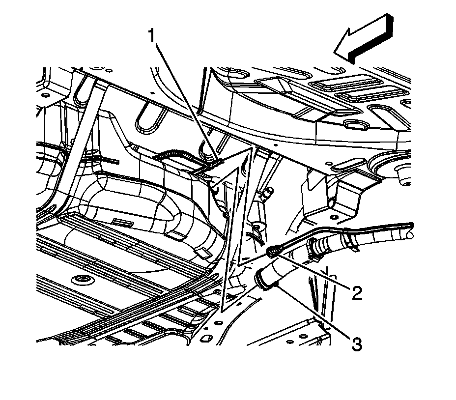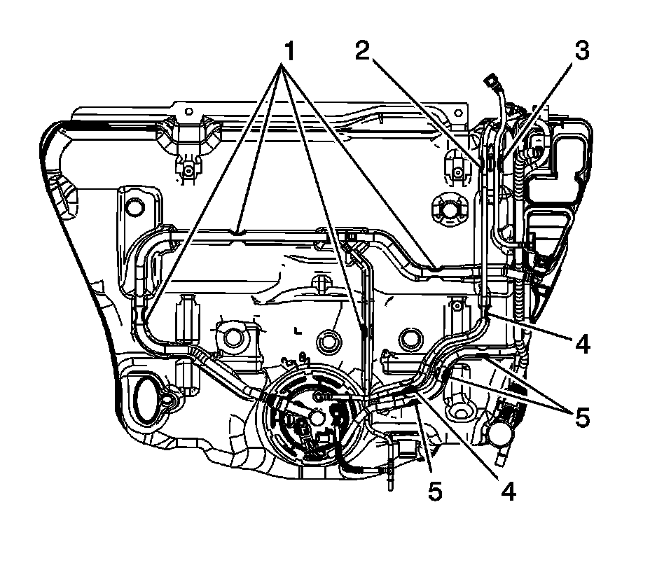 5. Remove the EVAP emission canister purge pipe from the retaining features (3) built into the fuel tank.