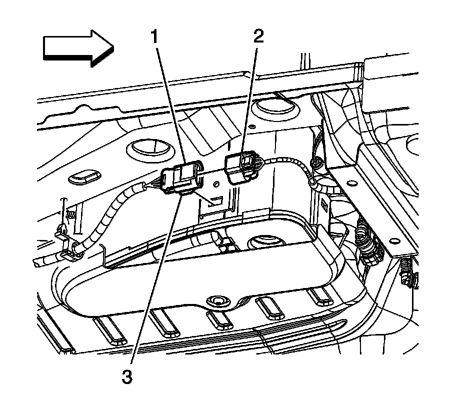 1. Disconnect the fuel tank fuel pump module wiring harness electrical connectors (1, 2) from the fuel pressure sensor if equipped, and the module.
