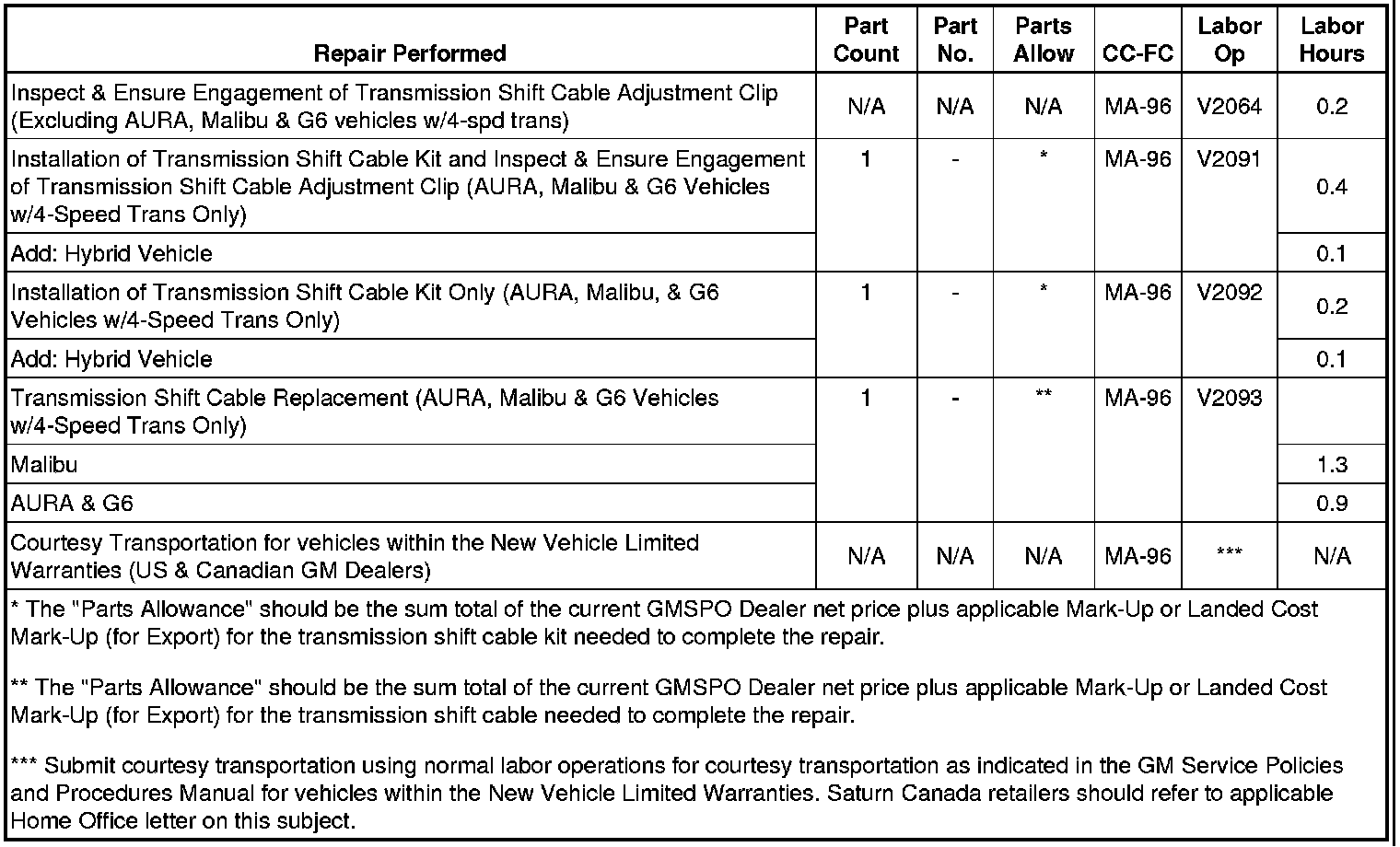 Note: If replacement of the shift cable is required on vehicles other than AURA, Malibu or G6 equipped with a 4-speed transmission, H-route the claim for wholesale authorization.