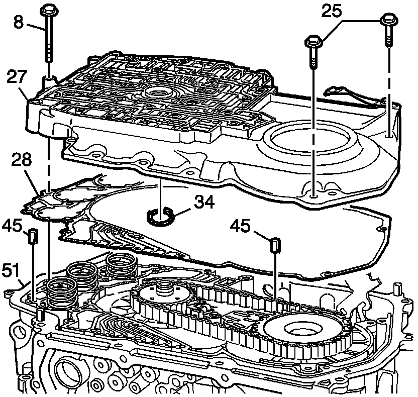 3. Install a new channel plate to case gasket (28) onto the transmission case (51).