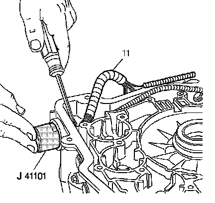 3. Push the J 41101 onto the pass-through connector from the outside of the transmission case in order to compress the pass-through connector's retaining tabs.
