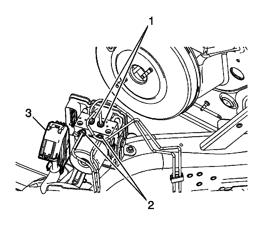 4. Install the brake modulator and bracket assembly (3). Align the brake modulator assembly bracket to the lower bracket bolt (2).