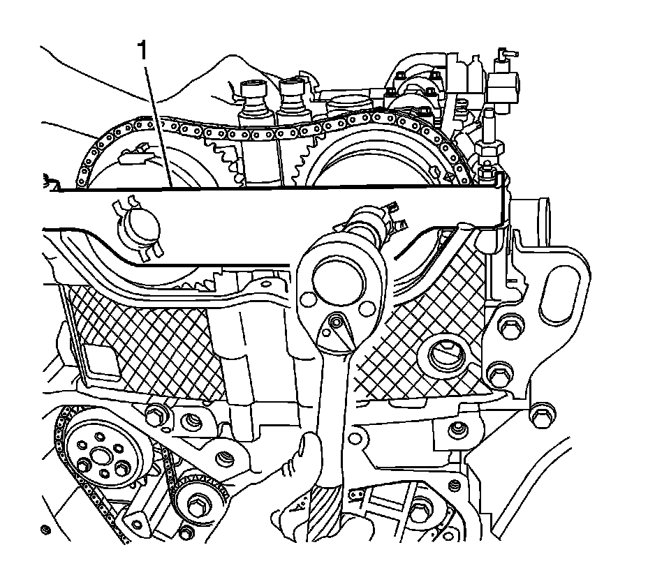 18. Remove the timing chain retention tool EN-48749 (1) from the exhaust side of the timing chain.