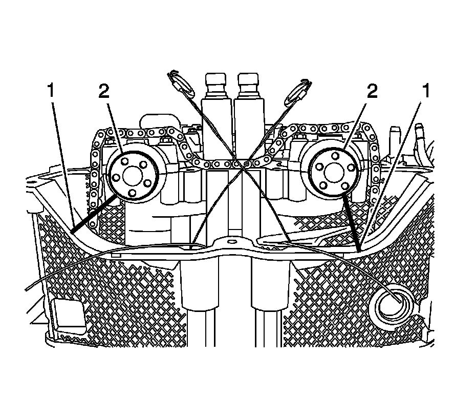 29. Install a rubber band (1) around the top of the upper timing chain guides (2) in order to pull the guides together.
