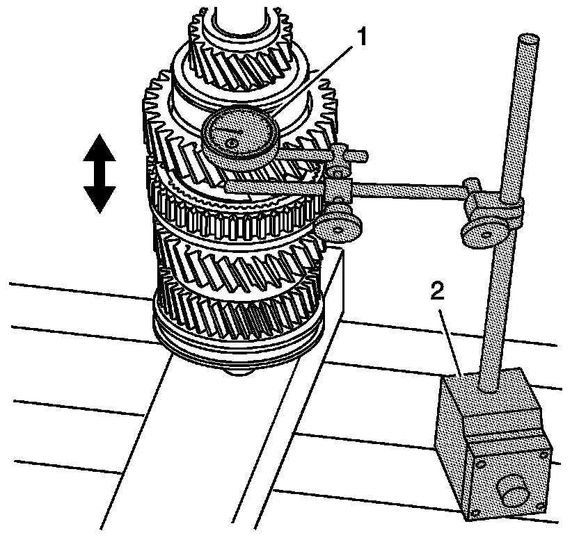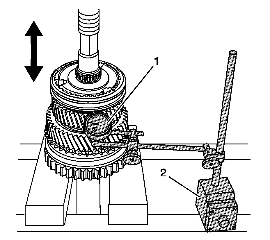 5. Using J 8001-3 or J 26900-12 (1) and J 26900-13 (2), measure the 3rd gear axial play.