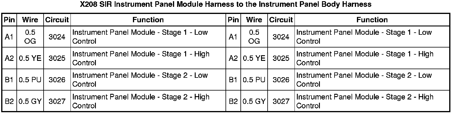 X208 SIR Instrument Panel Module Harness to the Instrument Panel Body Harness