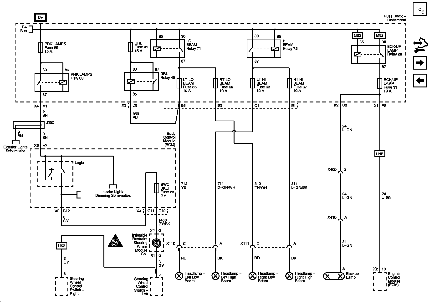 LT LO BEAM, LT HI BEAM, RT LO BEAM, and RT HI BEAM, Park Lamp, DRL, and BCK/UP Lamp (M82) Fuses (SKY)