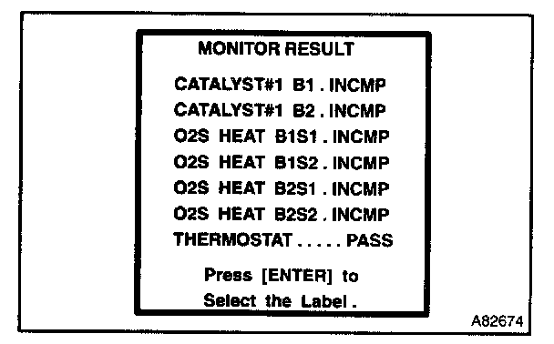 b. Enter "MONITOR RESULT" from "DIAGNOSIS / ENHANCED OBD II/MONITOR INFO/MONITOR RESULT" on the hand-held tester. You will see "Test ID" and "INCMP", "Pass" or "Fail" on the MONITOR RESULT screen.