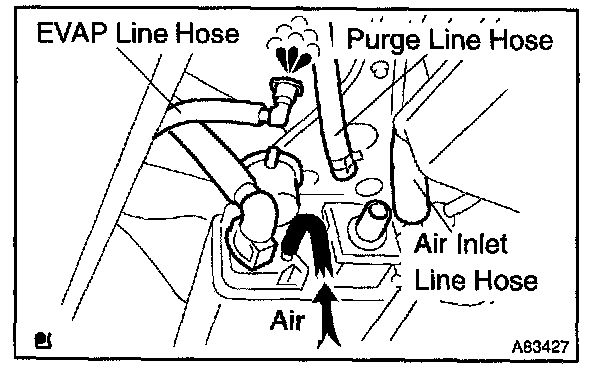 HINT: Check the fuel volume in the fuel tank if there is no ventilation in step (b). If the fuel is full, the EVAP line vent is closed by a float value of the fill check valve, therefore air cannot pass through the EVAP line hose. Reduce the fuel volume if necessary.